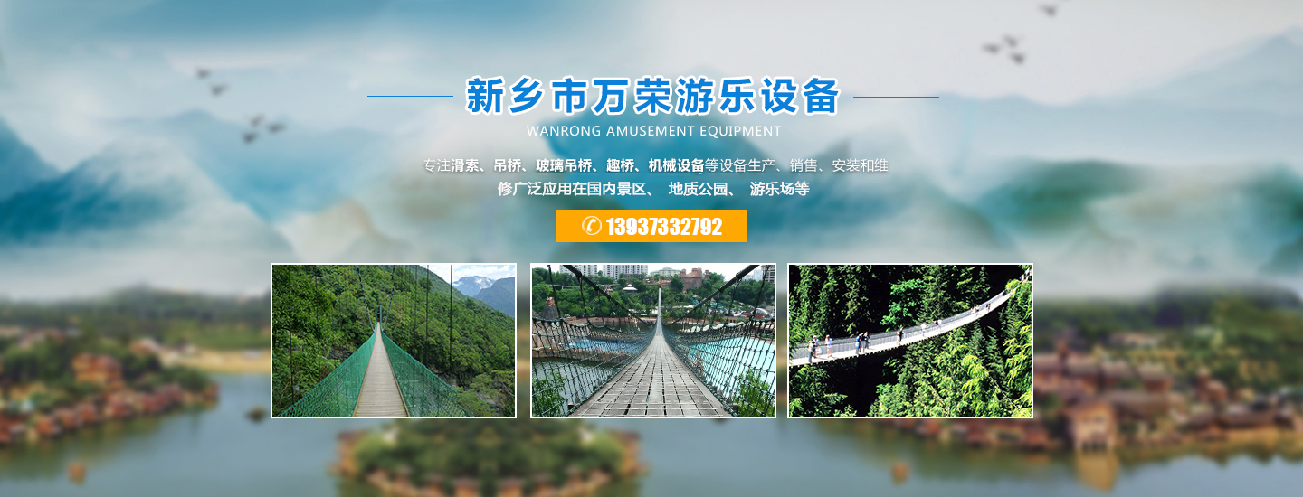 歡迎進入新鄉市萬榮機械有限公司官網!關鍵詞:玻璃水滑廠家,吊橋廠家, 景區吊橋價格, 滑索廠家, 游樂吊橋廠家, 玻璃吊橋, 防腐木吊橋廠商 ,景區吊橋, 滑索設備, 吊橋生產廠家, 吊橋多少錢, 木板吊橋, 吊橋施工廠家